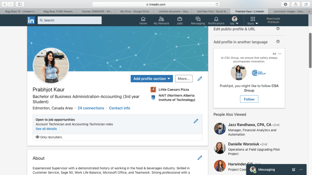 Overall this video course taught us the importance of LinkedIn profile and how students can make best out of it to enhance their career. I have my own LinkedIn account but that is very basic and is mostly at default settings. I got to learn a lot about how I can improve my profile and make it reach out to people or companies that I want to work with in the future.
