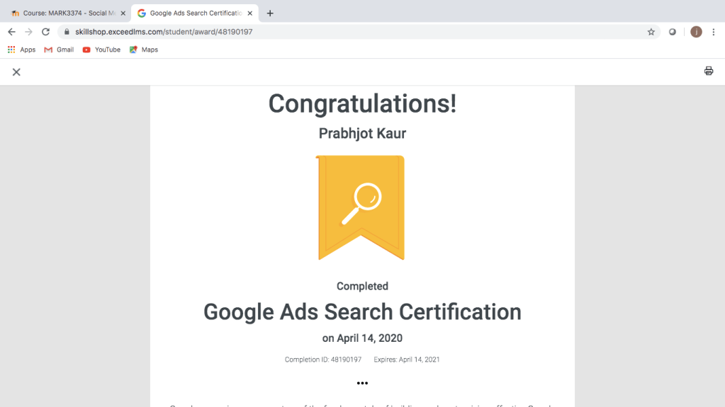 Conclusion: I have learned so many things through google skill workshop and got my certificate and below is the screenshot go that certificate. There is a lot more about google ads which is hard to summarize in this blog. I did not have any experience earlier with google ads however, now i have a better undersatnding of how these ads works and how business can get benefit from these. I am an accounting student however if i get a change in future to work with marketing department of an organization i would definitely apply this new knowledge there.